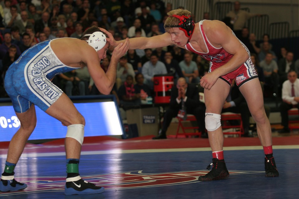 Penn State’s David Taylor and Cornell’s Kyle Dake faced each other at the NWCA All-Star Classic, Nov. 3, in Washington, D.C., with Dake winning the 165-pound exhibition in overtime. (Paul Swisher image)